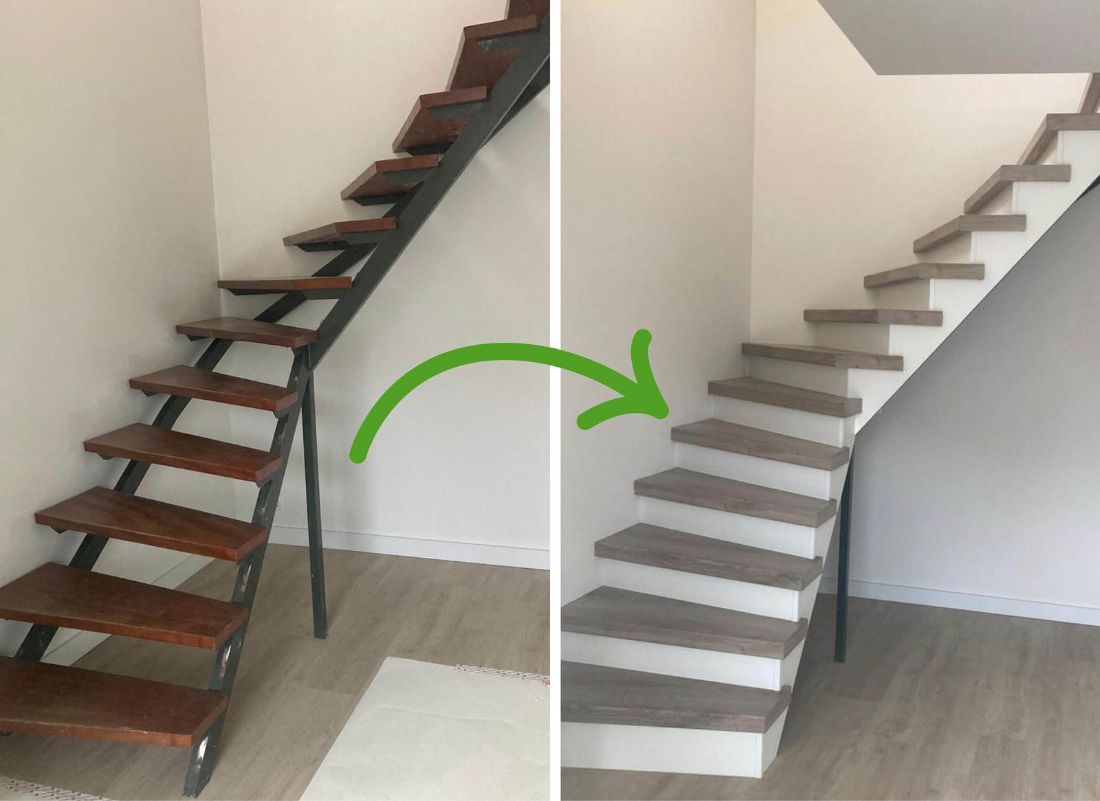 Lors d'une rénovation, vous pouvez également choisir de faire fermer votre escalier ouvert. Pour cela, nous posons des contremarches entre les marches existantes lors du revêtement, ce qui permet de former un ensemble fermé.